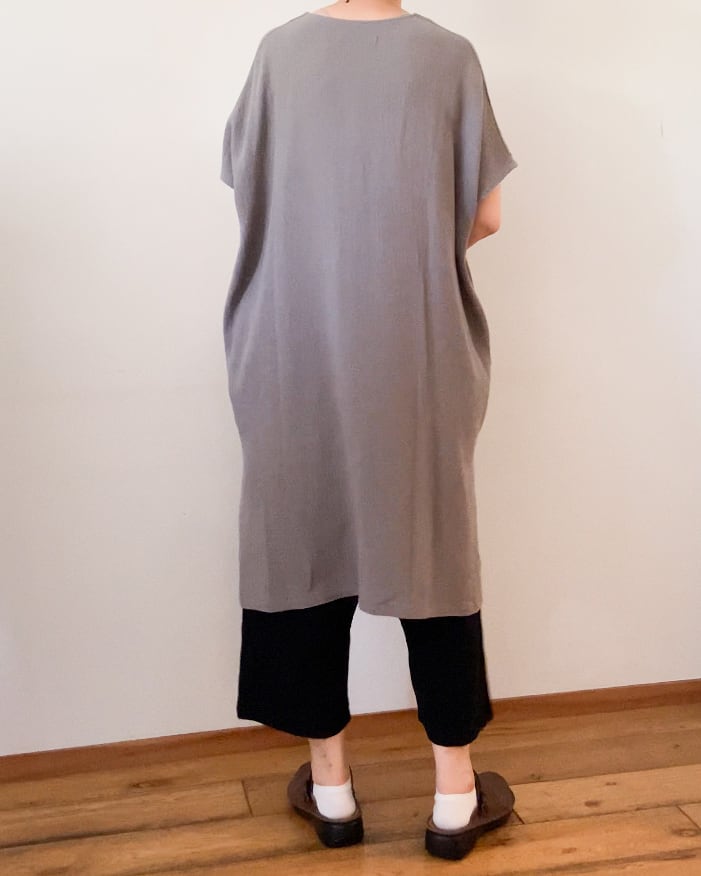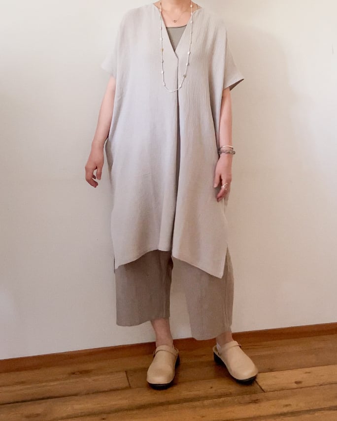 程よい厚みがあり流れるような模様が特徴の生地で、残暑から寒い季節にはレギンスを重ねると長い季節活躍します。