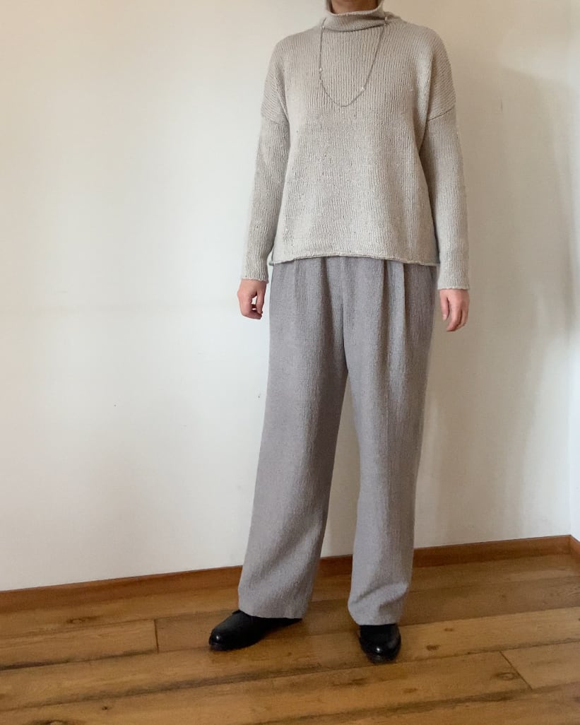たて・よこ合わせて3色の糸からつくられる、ウールの生地。その配色と、凹凸が奥行きのある表情を生み、近くで見ると細かなチェック柄の様な生地になっています。