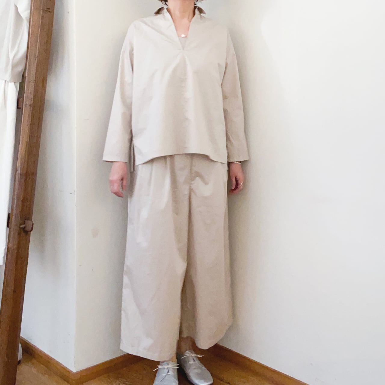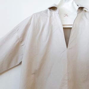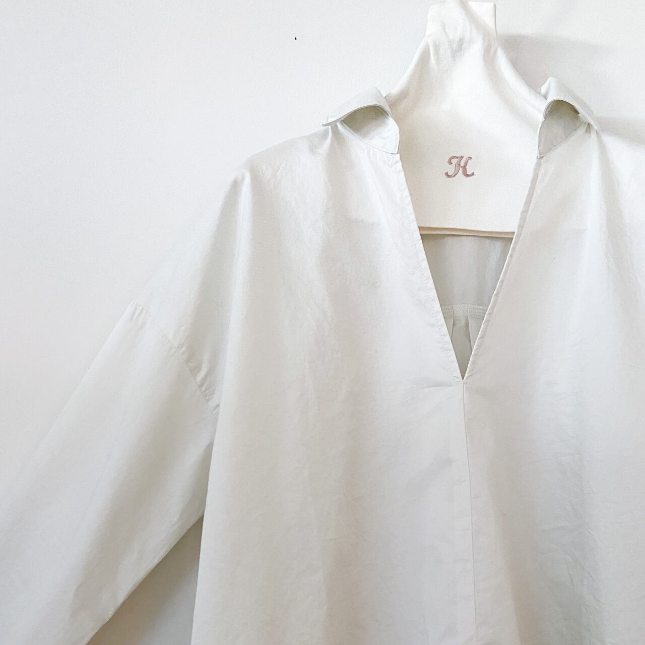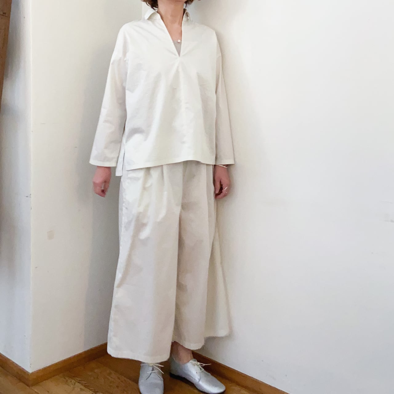 ほのかな光沢があり、小さめの衿のスキッパーシャツはカジュアルになりすぎない上品な印象に。