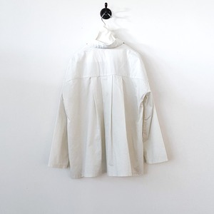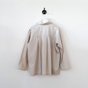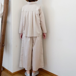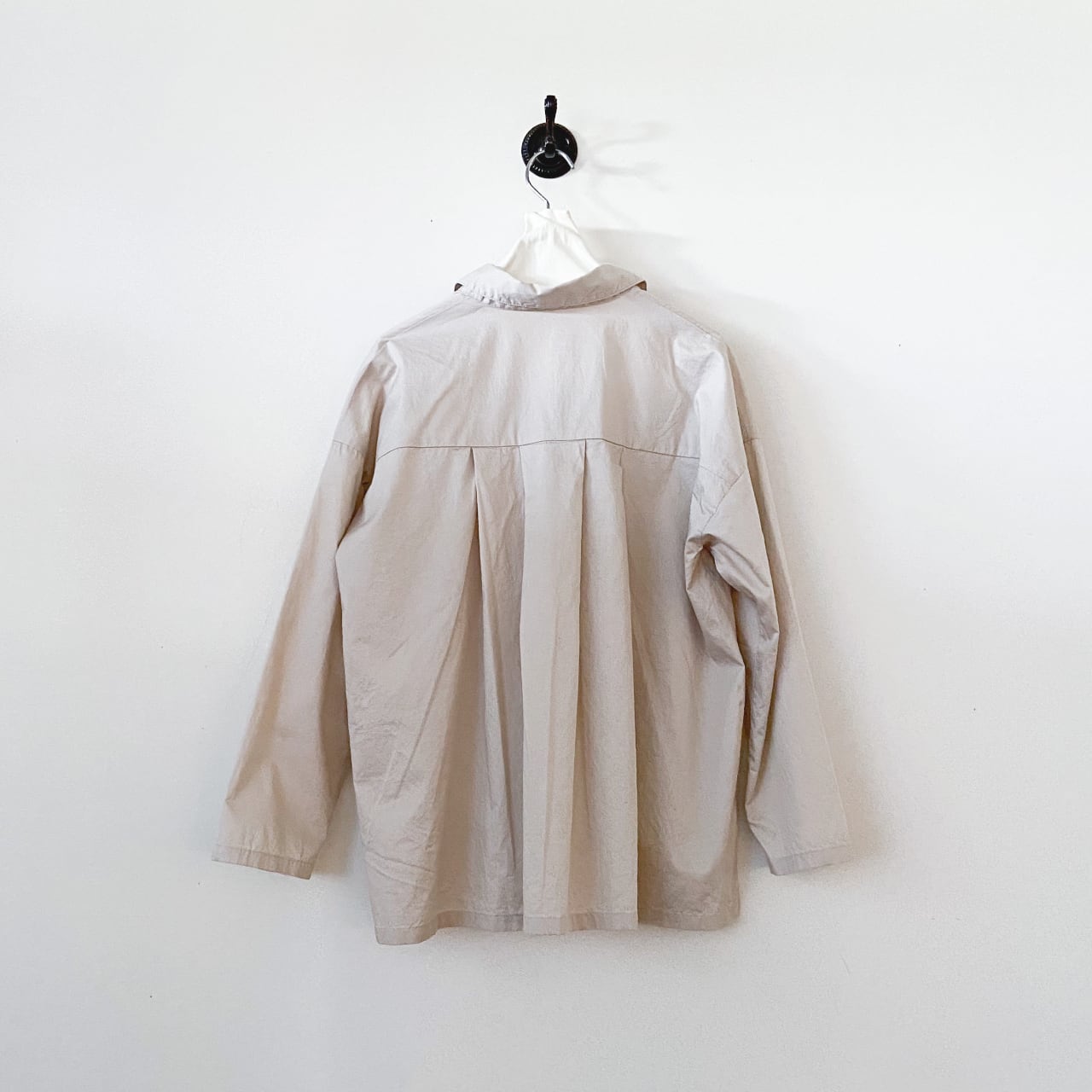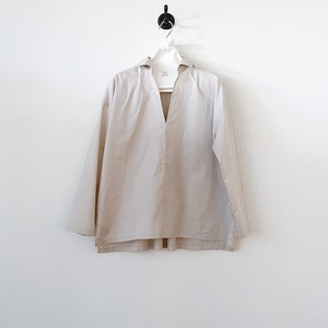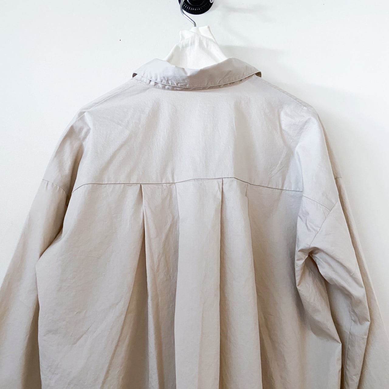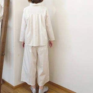 ほのかな光沢があり、小さめの衿のスキッパーシャツはカジュアルになりすぎない上品な印象に。