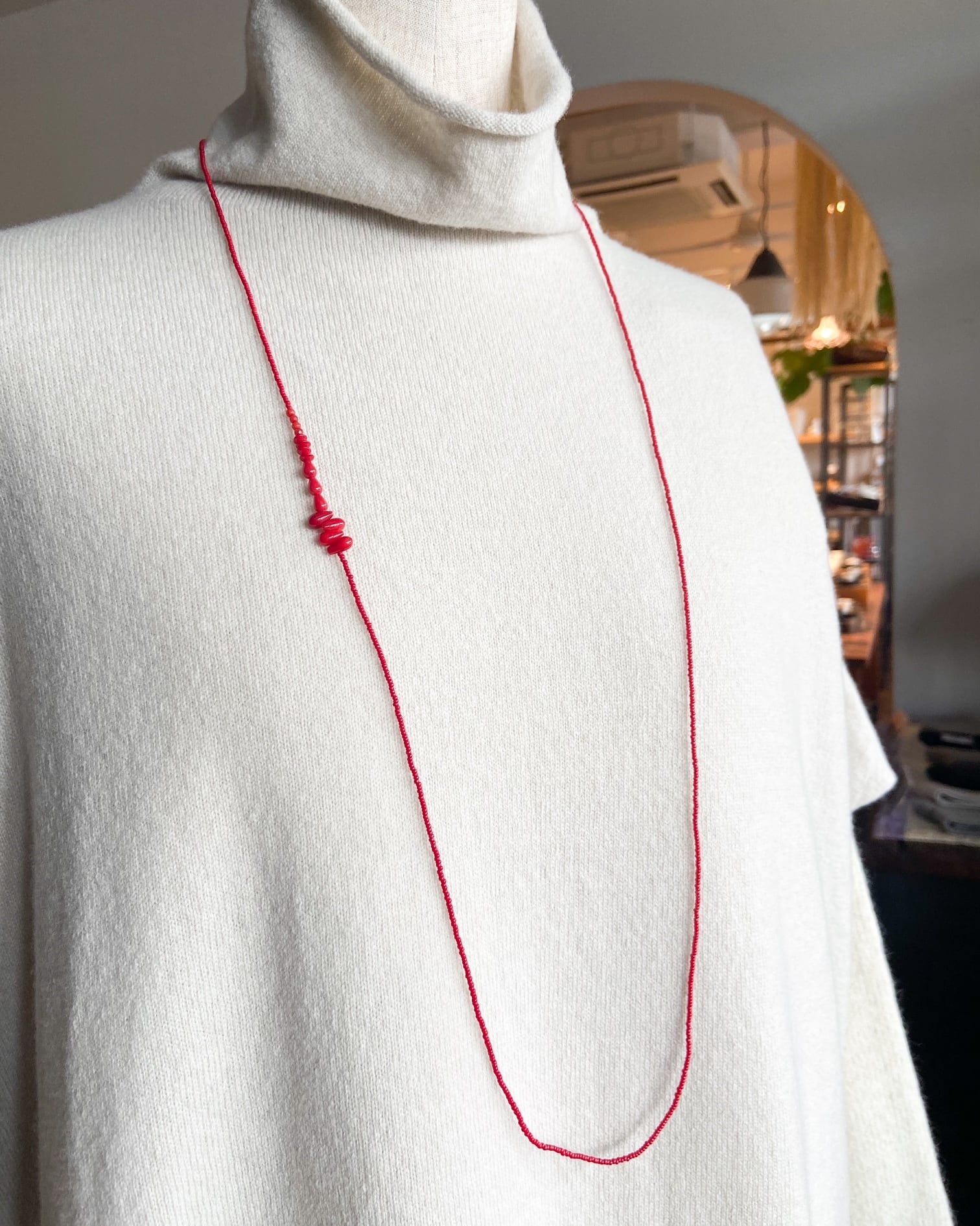 真っ赤なサンゴとガラスビーズが魅力的なロングネックレス