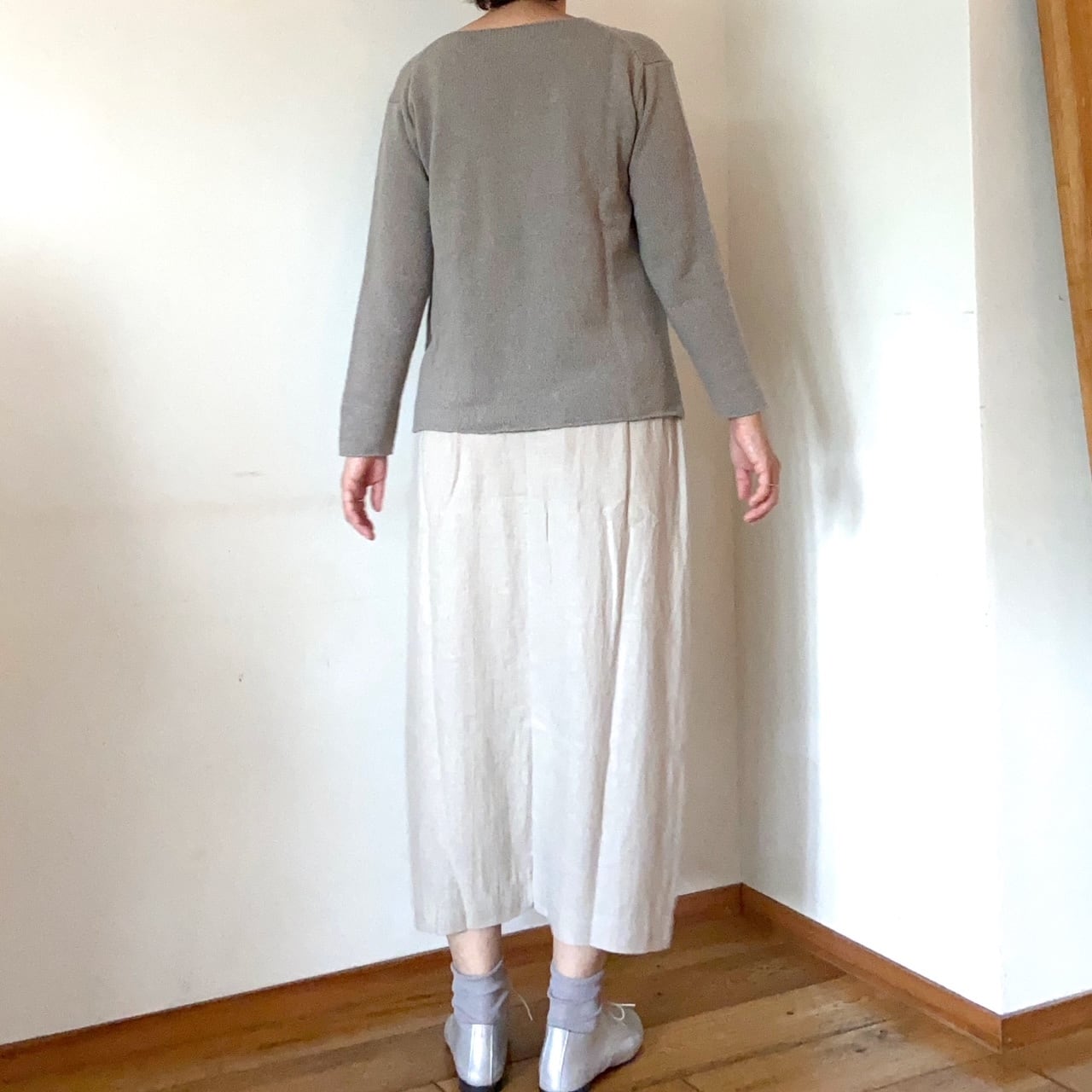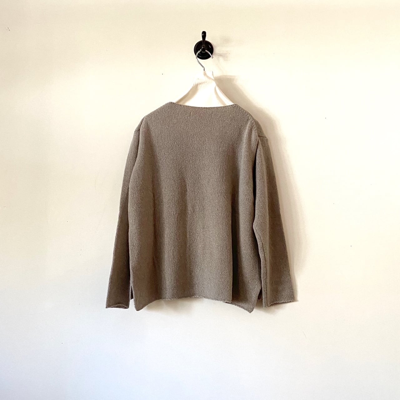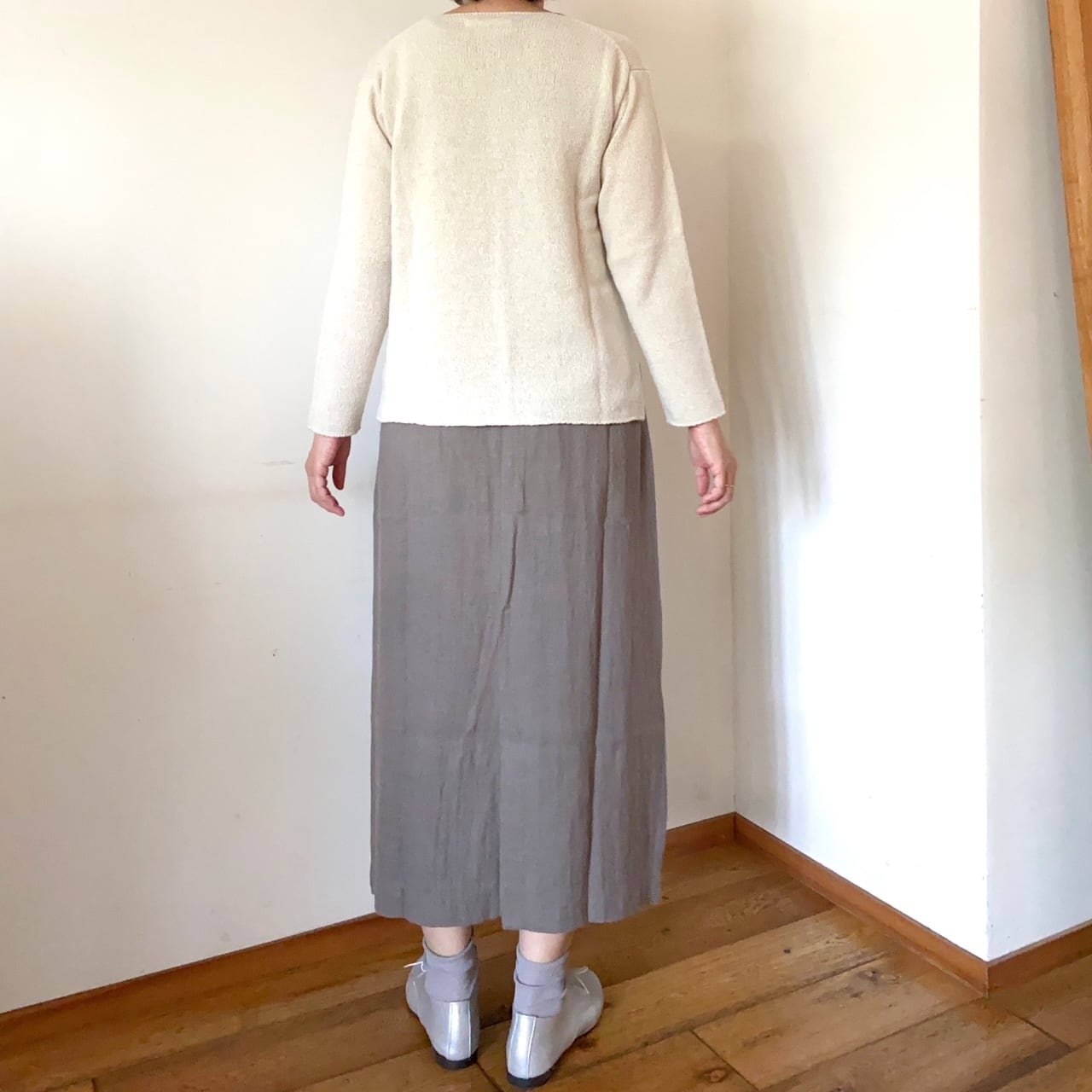 定番のプレスウールシリーズから残る端材を粉砕して、新たな糸に生まれ変わったrenew-wool。そこにシルクの落ち綿で作られた紬糸を組み合わせて、軽さと雰囲気のある糸を作りました。ウールにシルクの滑らかさが加わり、優しい肌触りのプルオーバーです。
