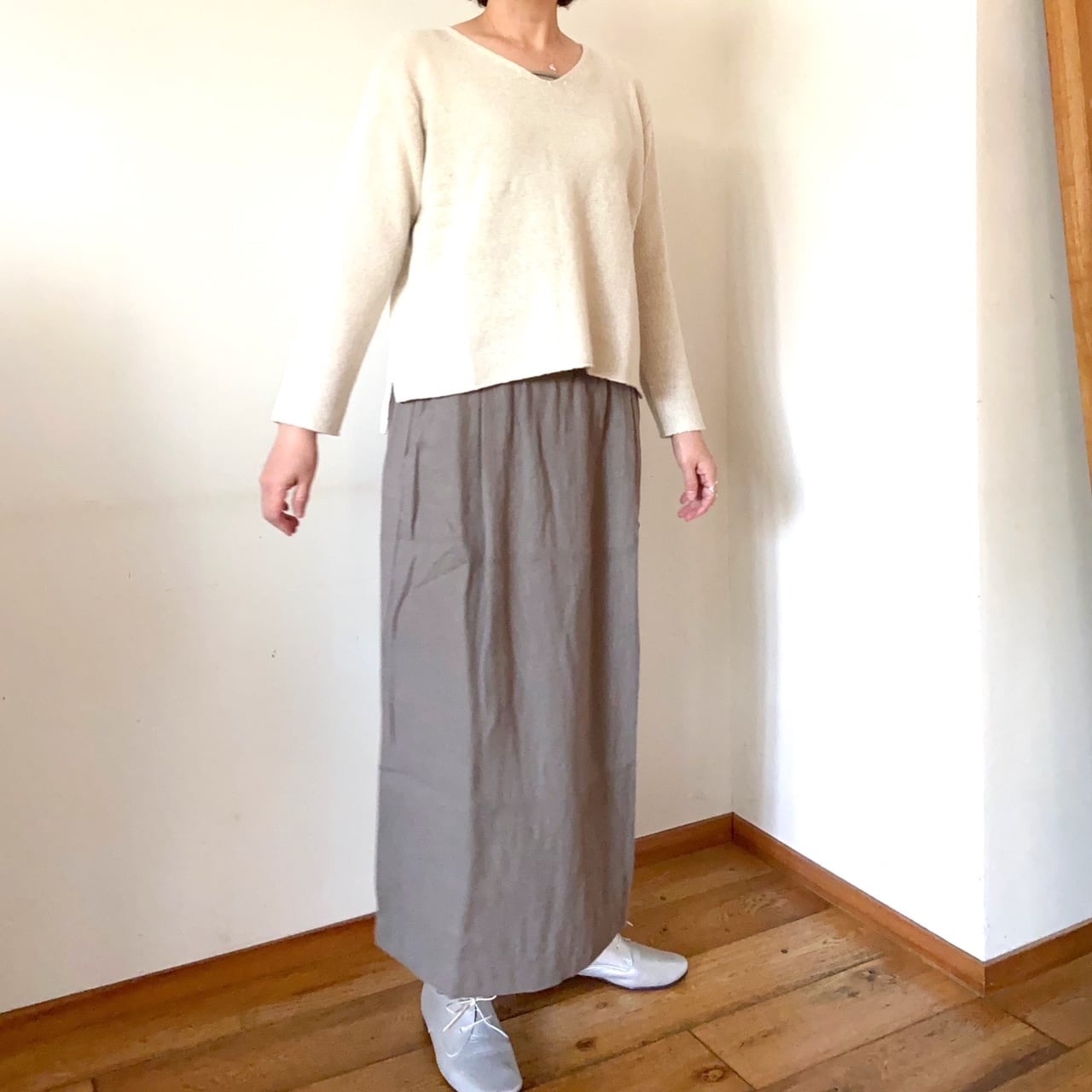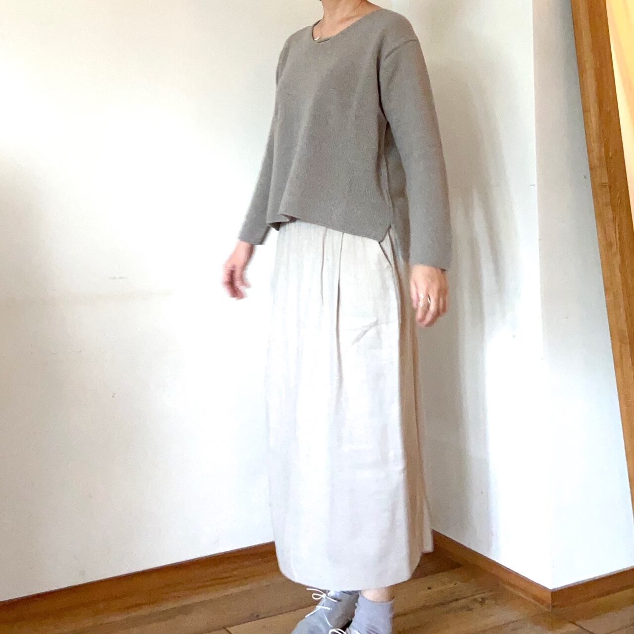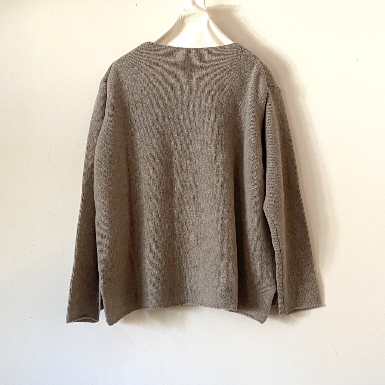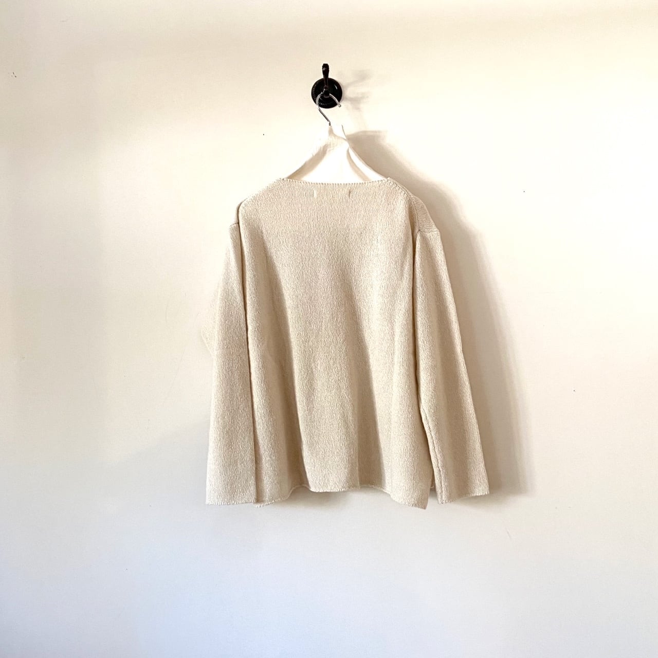 定番のプレスウールシリーズから残る端材を粉砕して、新たな糸に生まれ変わったrenew-wool。そこにシルクの落ち綿で作られた紬糸を組み合わせて、軽さと雰囲気のある糸を作りました。ウールにシルクの滑らかさが加わり、優しい肌触りのプルオーバーです。