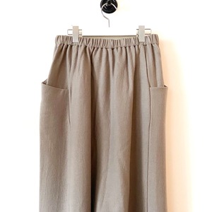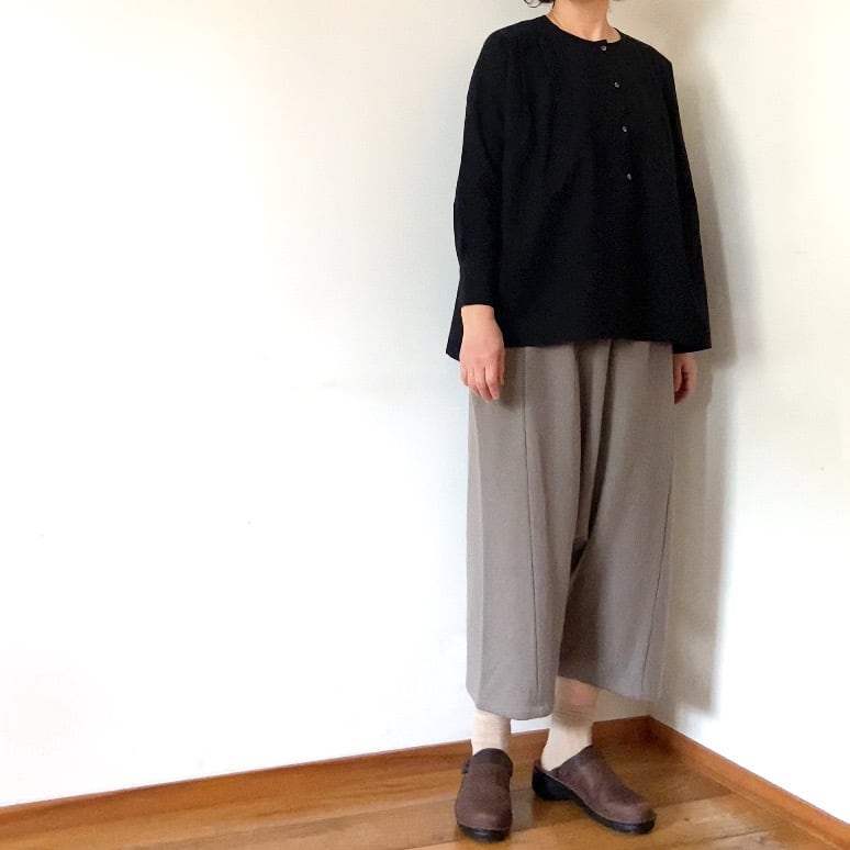 ウール100%の天竺生地を起毛させたカットソー生地です。伸縮性のある素材は動きに合わせて身体に添い、重ね着をしても快適に過ごせます。程よい厚みと落ち感があることから、温かく心地よく過ごしていただけます。切り替えやポケットのデザインがポイントの、上品で大人可愛いサルエルパンツです。