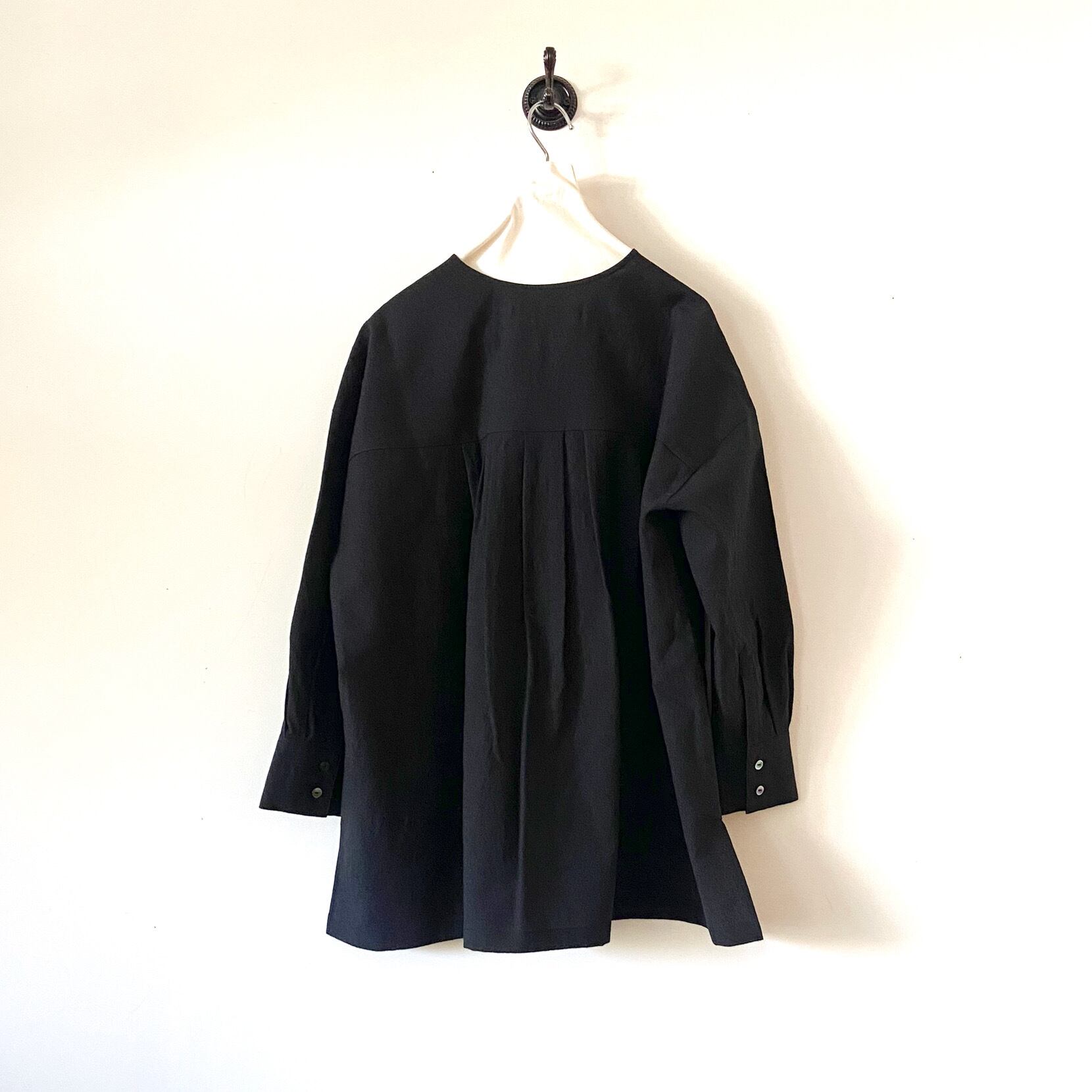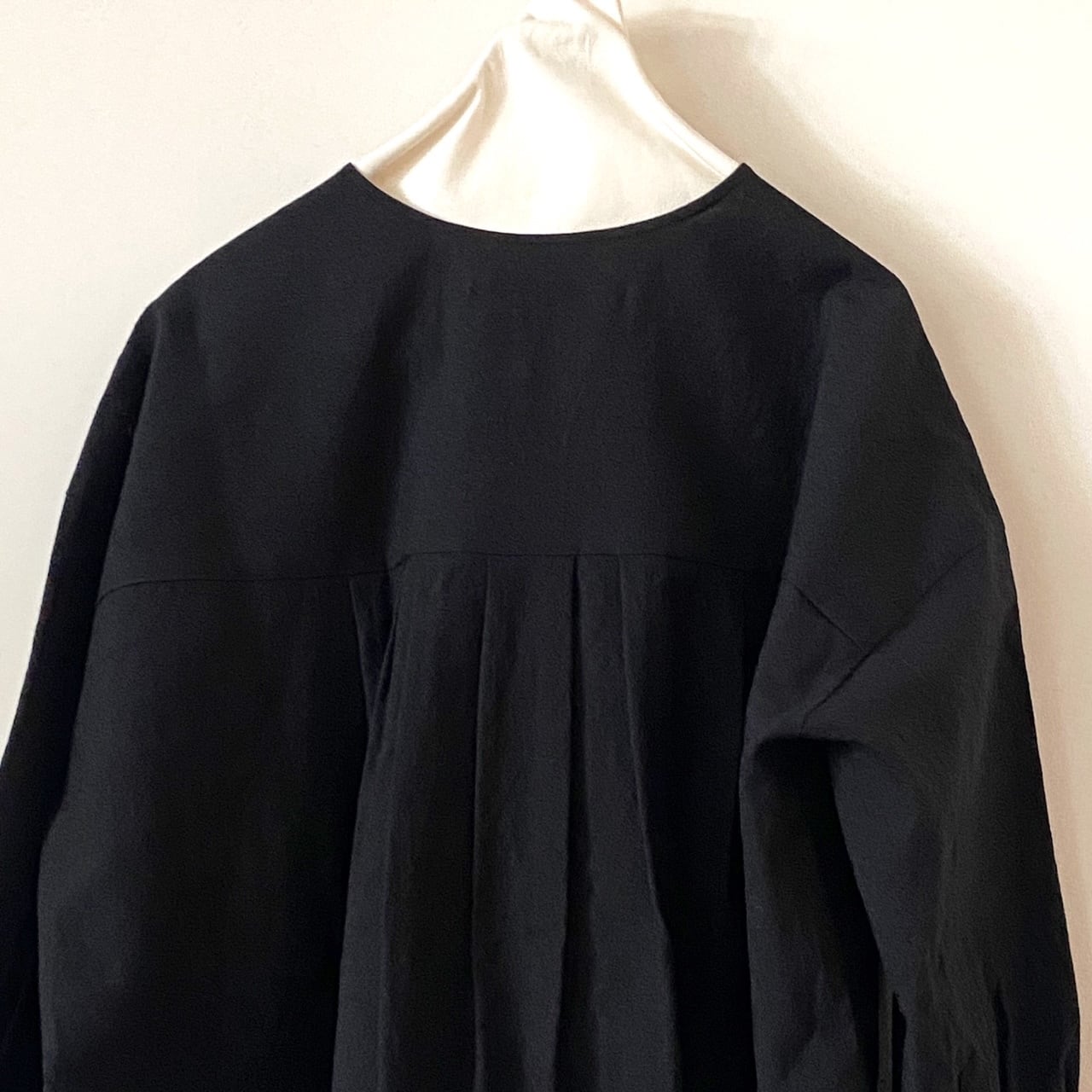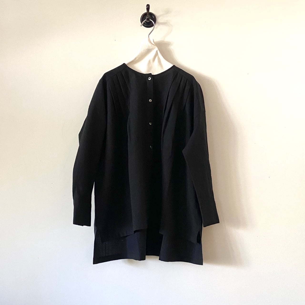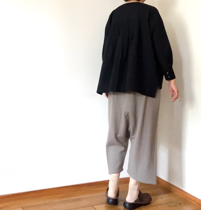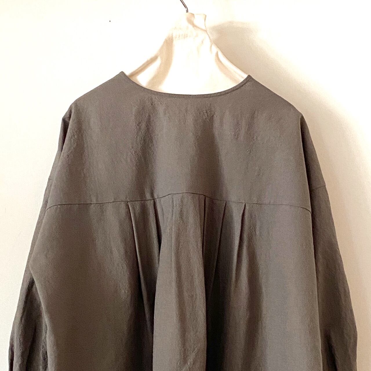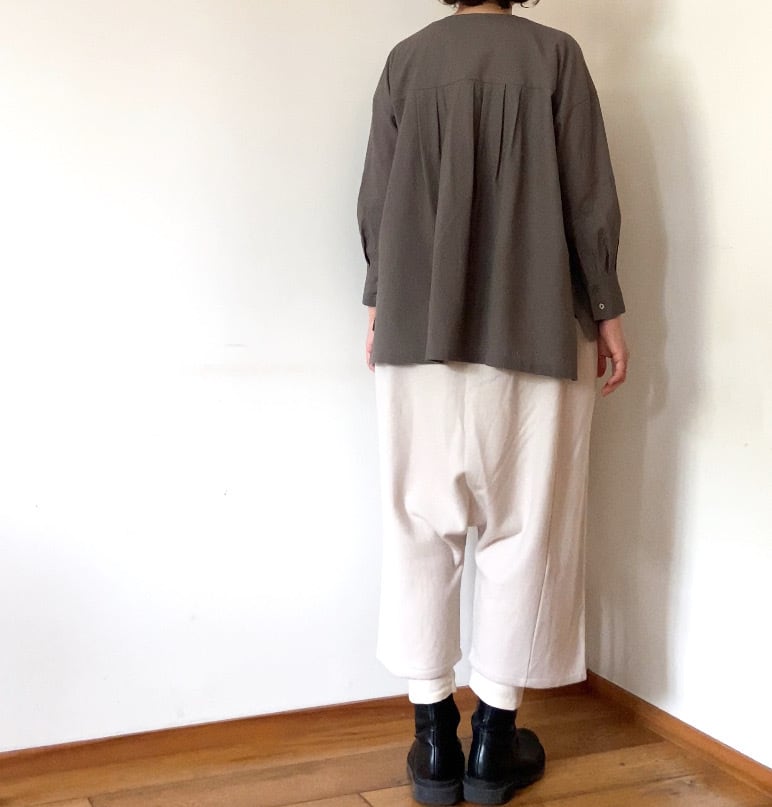 通常のウールよりも繊維が細くしなやかなエクストラファインメリノの原毛を使用しています。ウールならではの縮みと仕上げの加工により、特徴的なシボのある生地となりました。ウール100%の生地でありながら手洗い洗濯も可能で、秋冬に限らず着用することができます。タックをデザインに取り入れていますが、深みのある色合いと生地の表情により、上品で落ち着いた印象に。ノーカラーのシャツはボタンを閉じてすっきりと、ボタンを開けてカジュアルにも。寒い時季にはニットの羽織りを重ねるコーディネートもおすすめです。