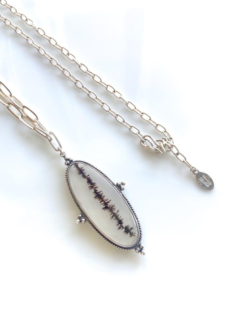 まるで森林の風景を石の中に閉じ込めたような、幻想的な美しさをもつ鉱物が混ざった石を使ったネックレスです。その模様は様々で、同じものは二つとないといわれています。